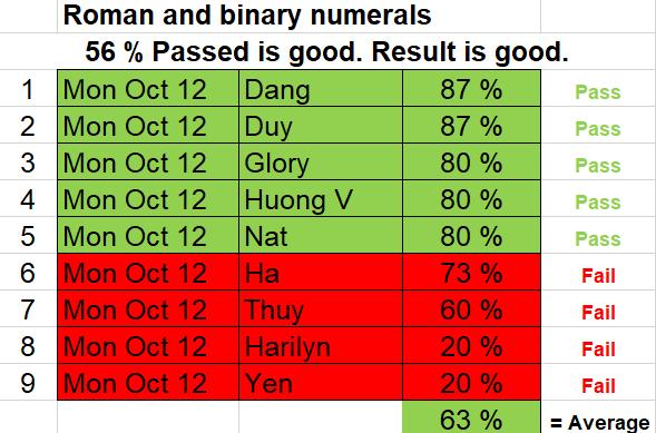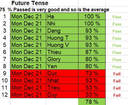 Dec 16, 80% passed with an average of 82% which is very good. Dec 9. Trieu and Tien didn't do their